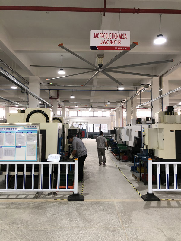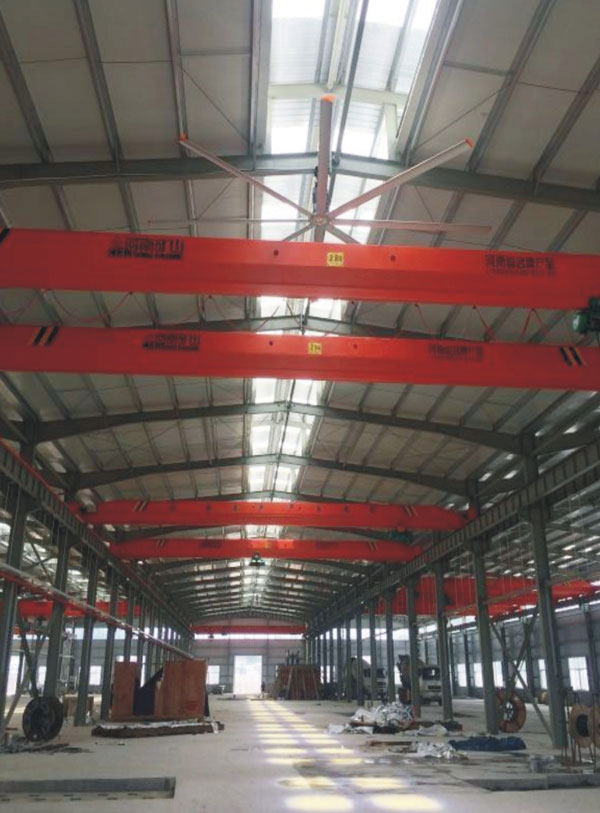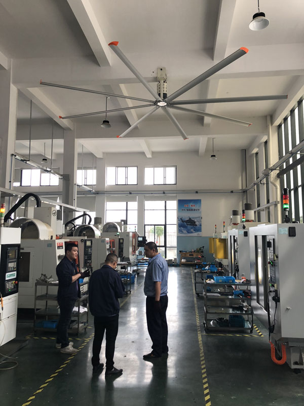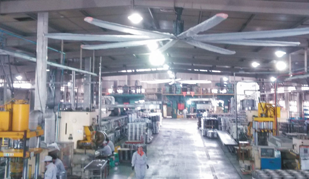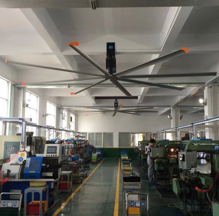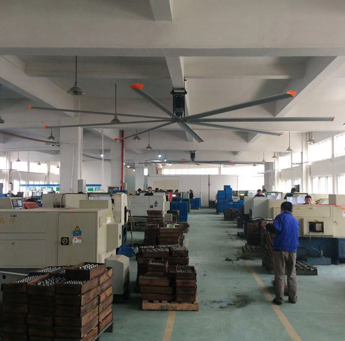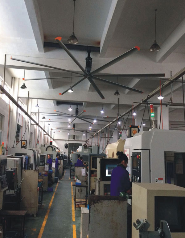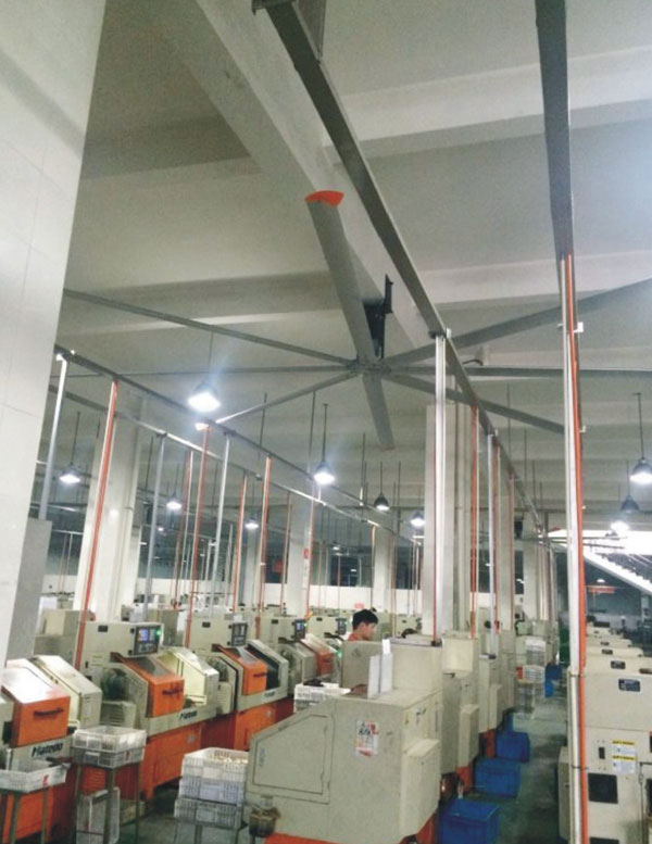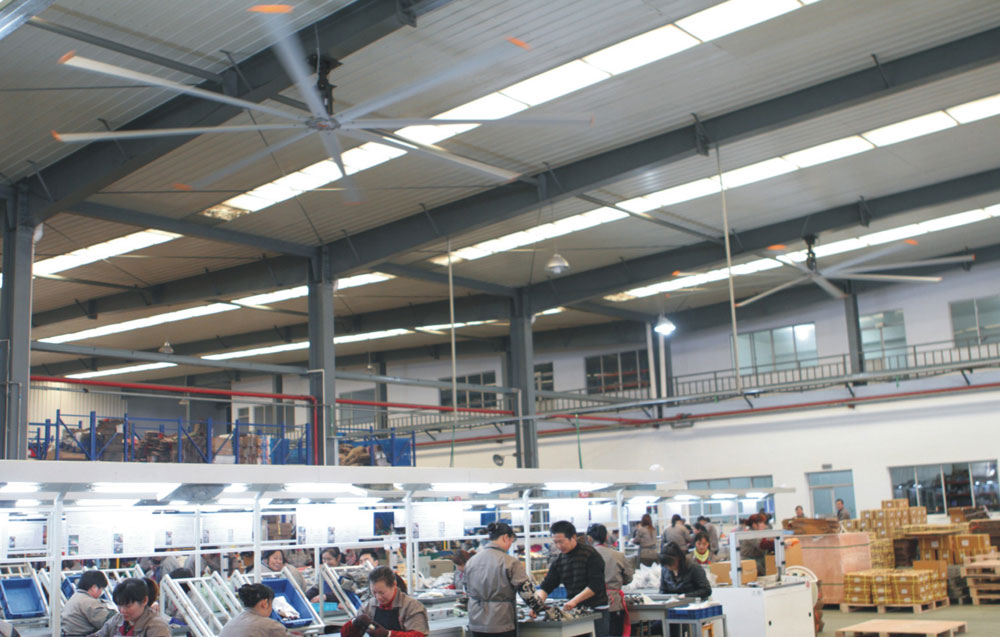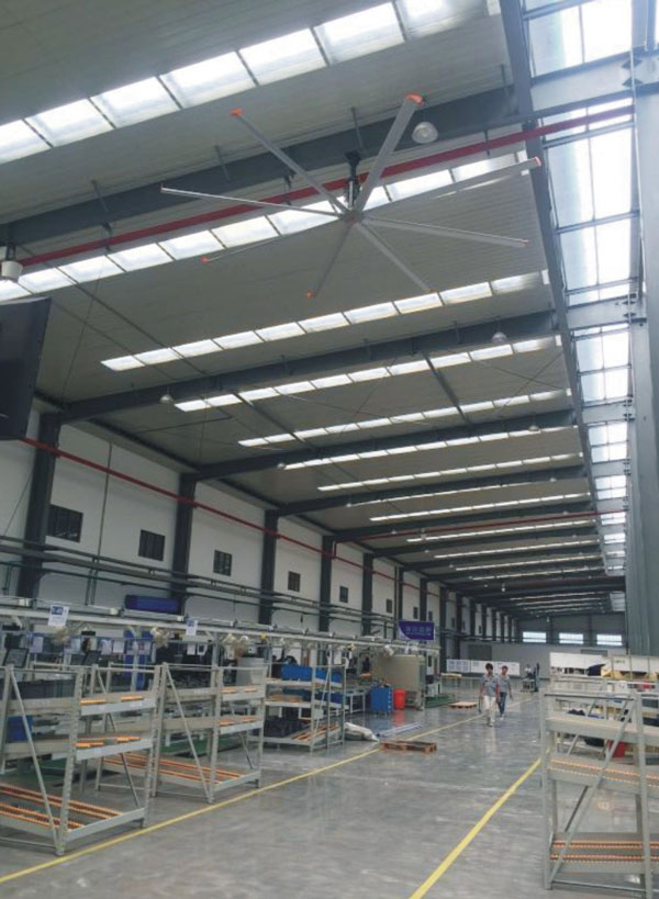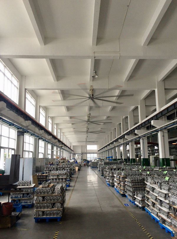 我公司生產(chǎn)的大型工業(yè)吊扇直接懸掛在廠房屋梁下,風(fēng)力柔和,能加快車間空氣流通,有效降低車間內(nèi)溫度,改善車間空氣環(huán)境質(zhì)量,有利于員工的身體健康。